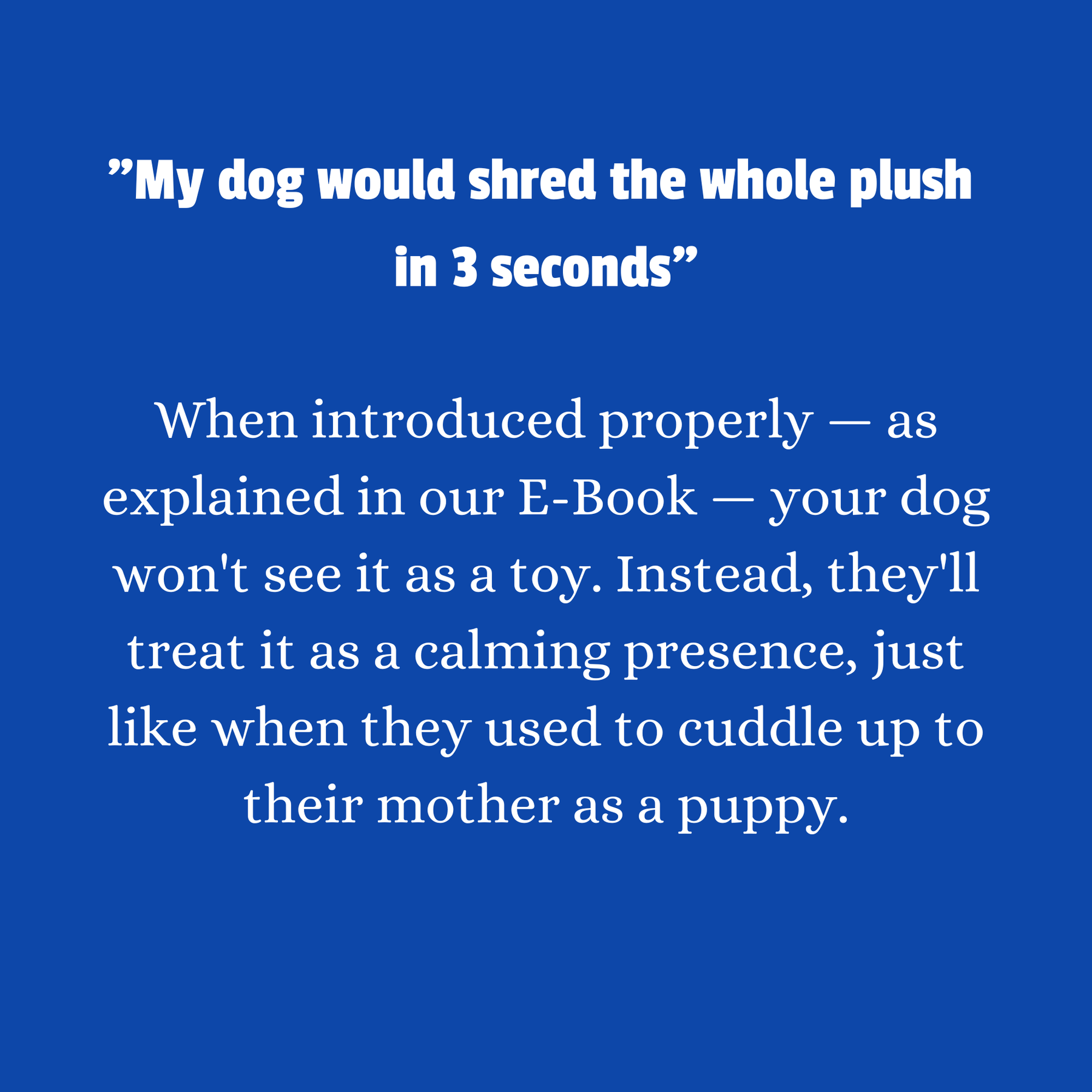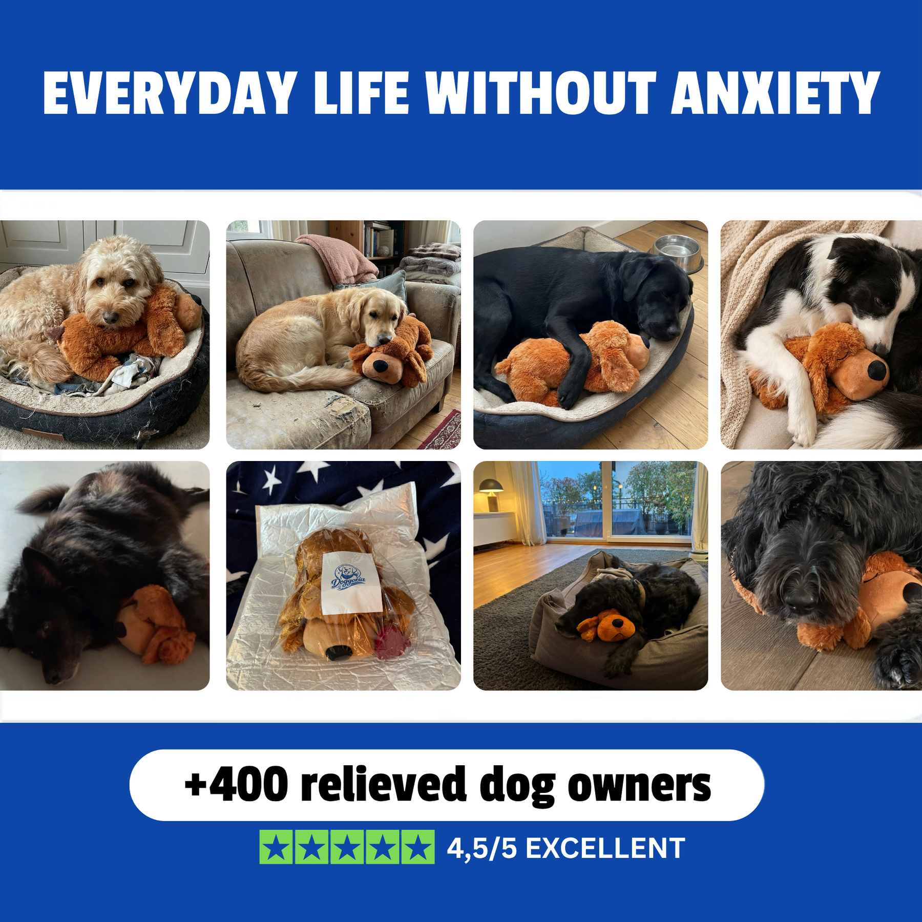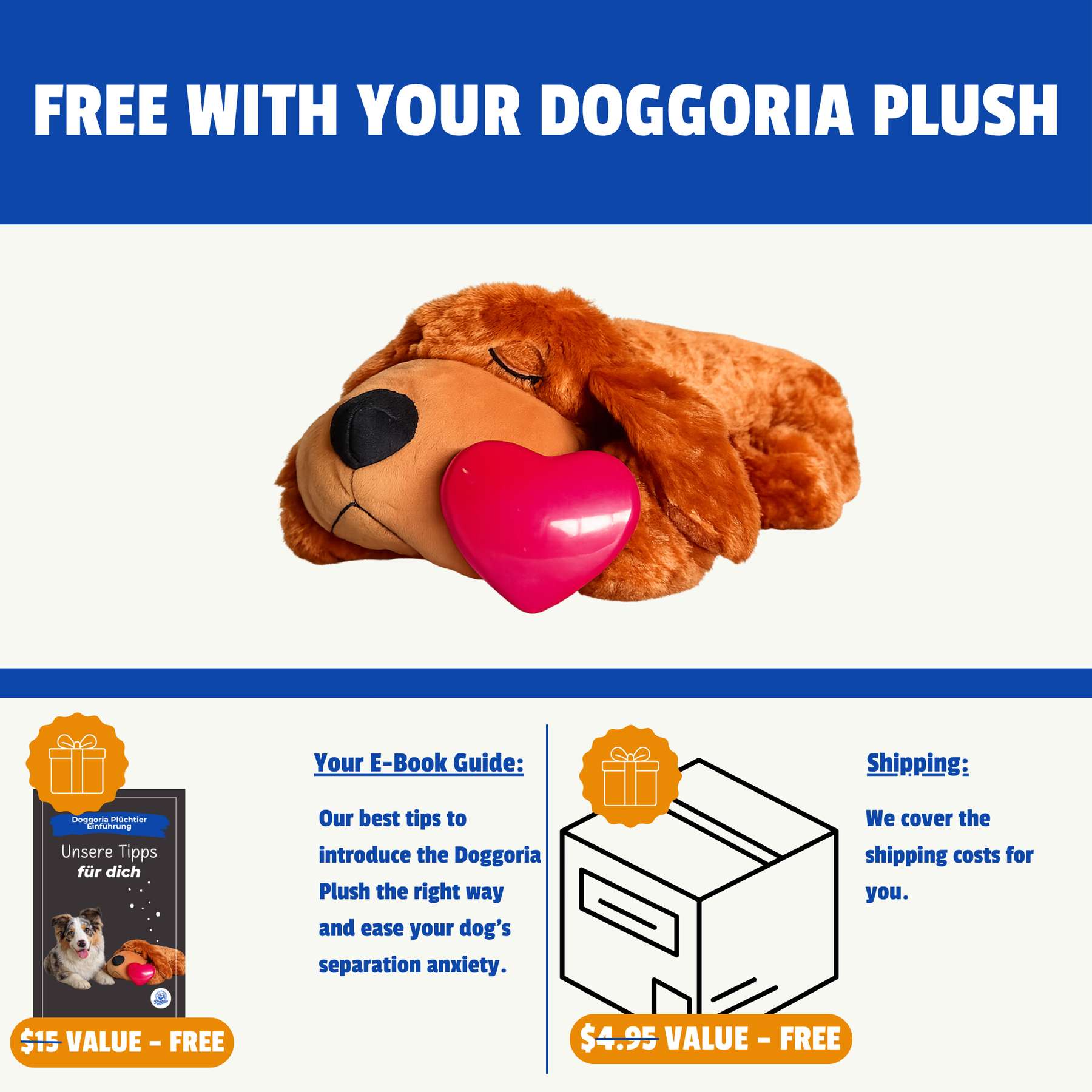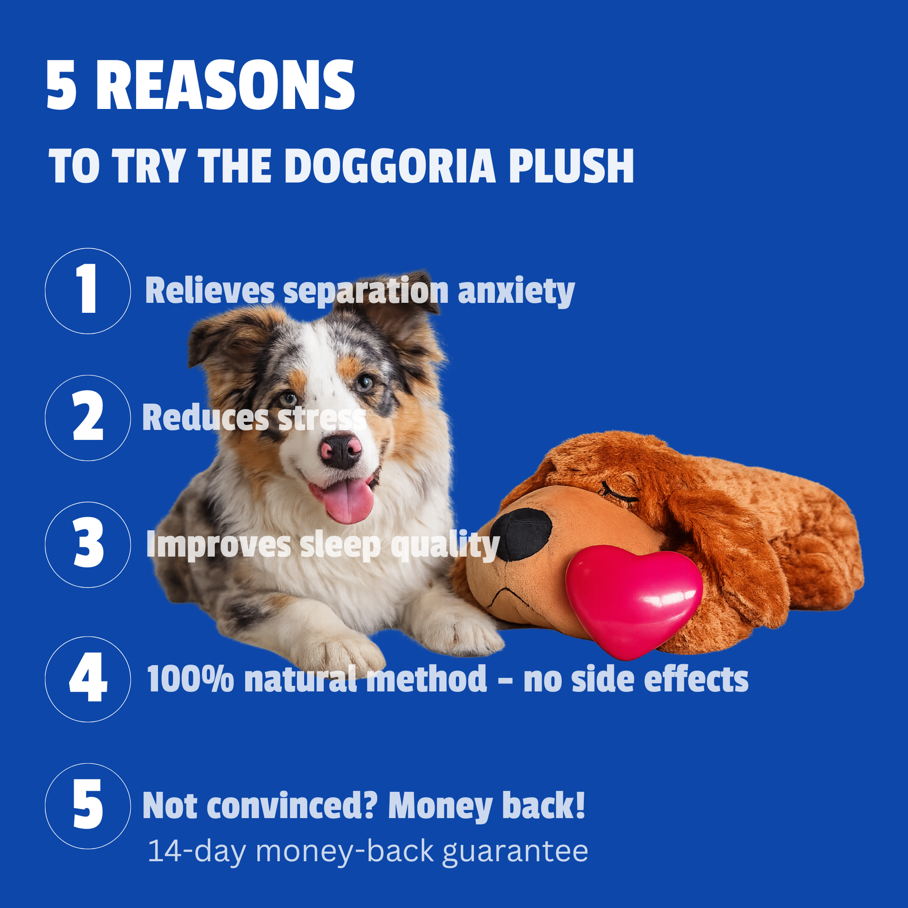 That's exactly why we created the Doggoria Plush: To give your dog a calming presence while you're away — and to let you walk out the door with a lighter heart.