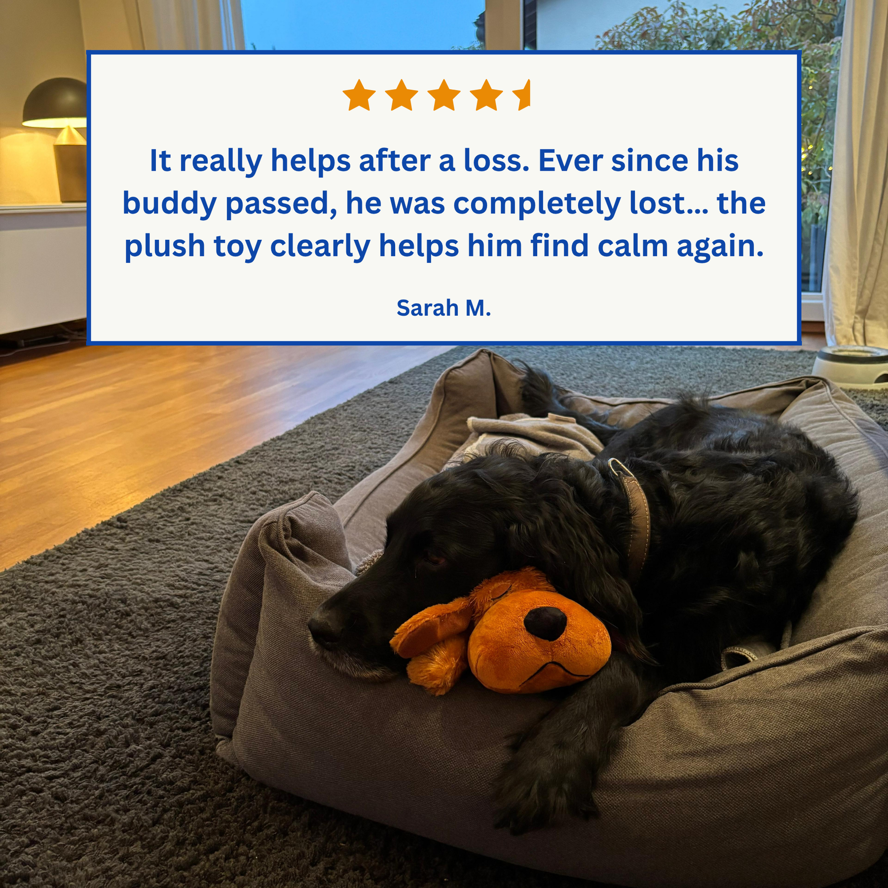The plush does the rest. Your dog cuddles up to it — and you can finally relax with a clear conscience.